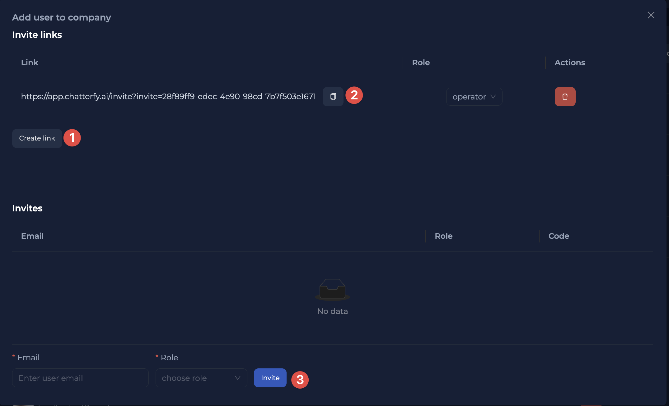В окне инвайтов выбрать один из двух способов: 1. По пригласительной ссылке (просто отправьте ее вашему сотруднику) 2. По email