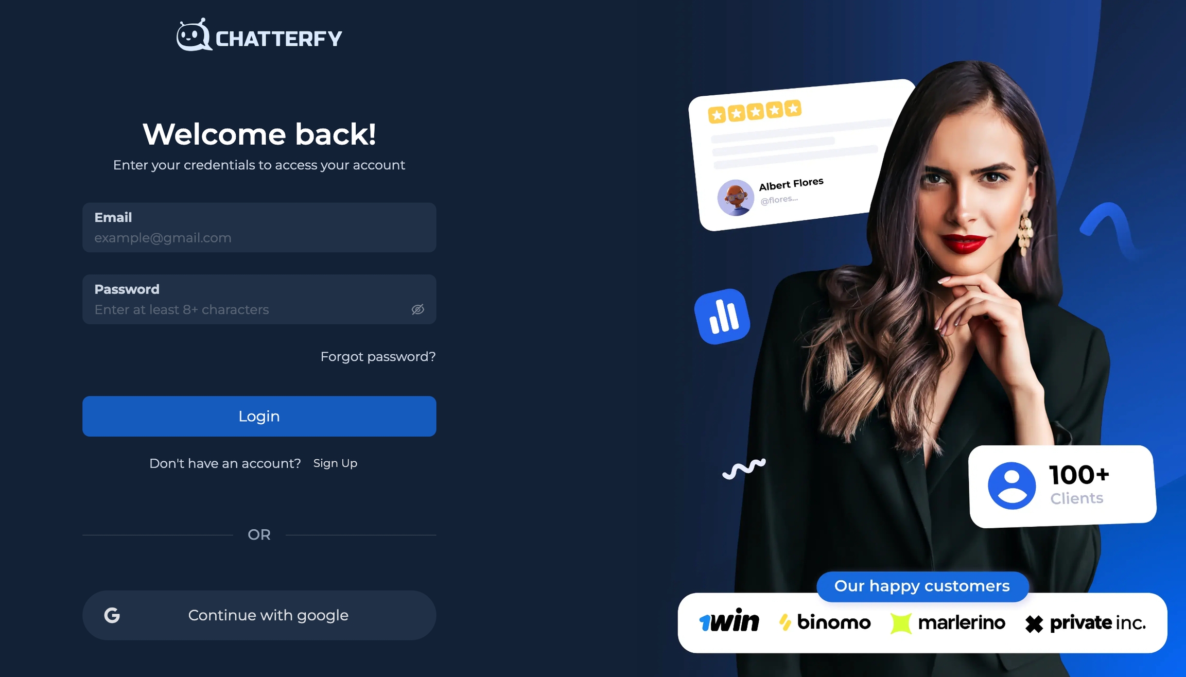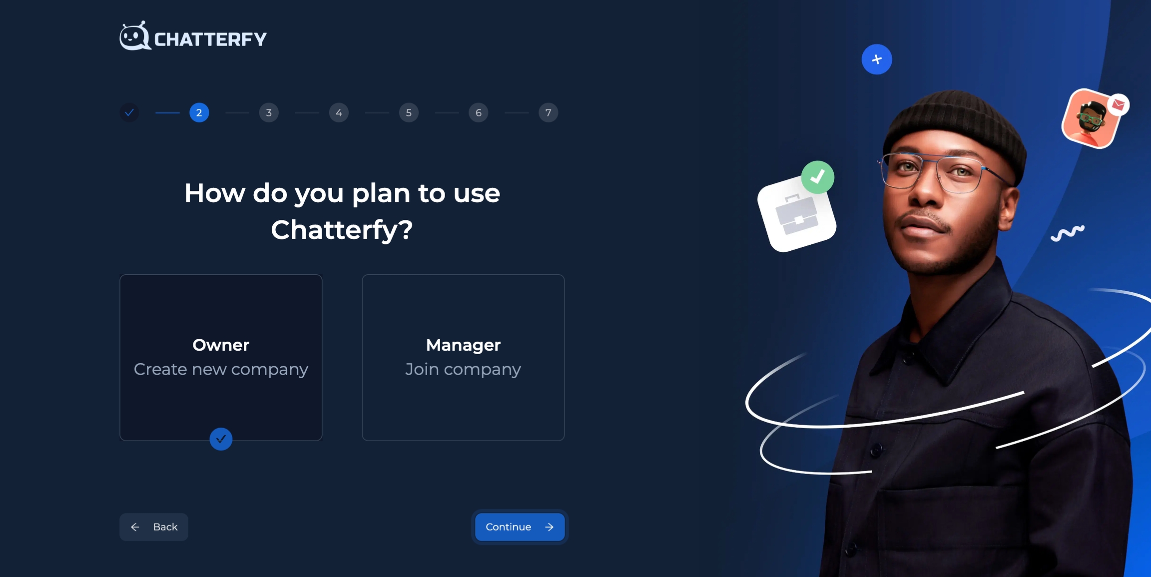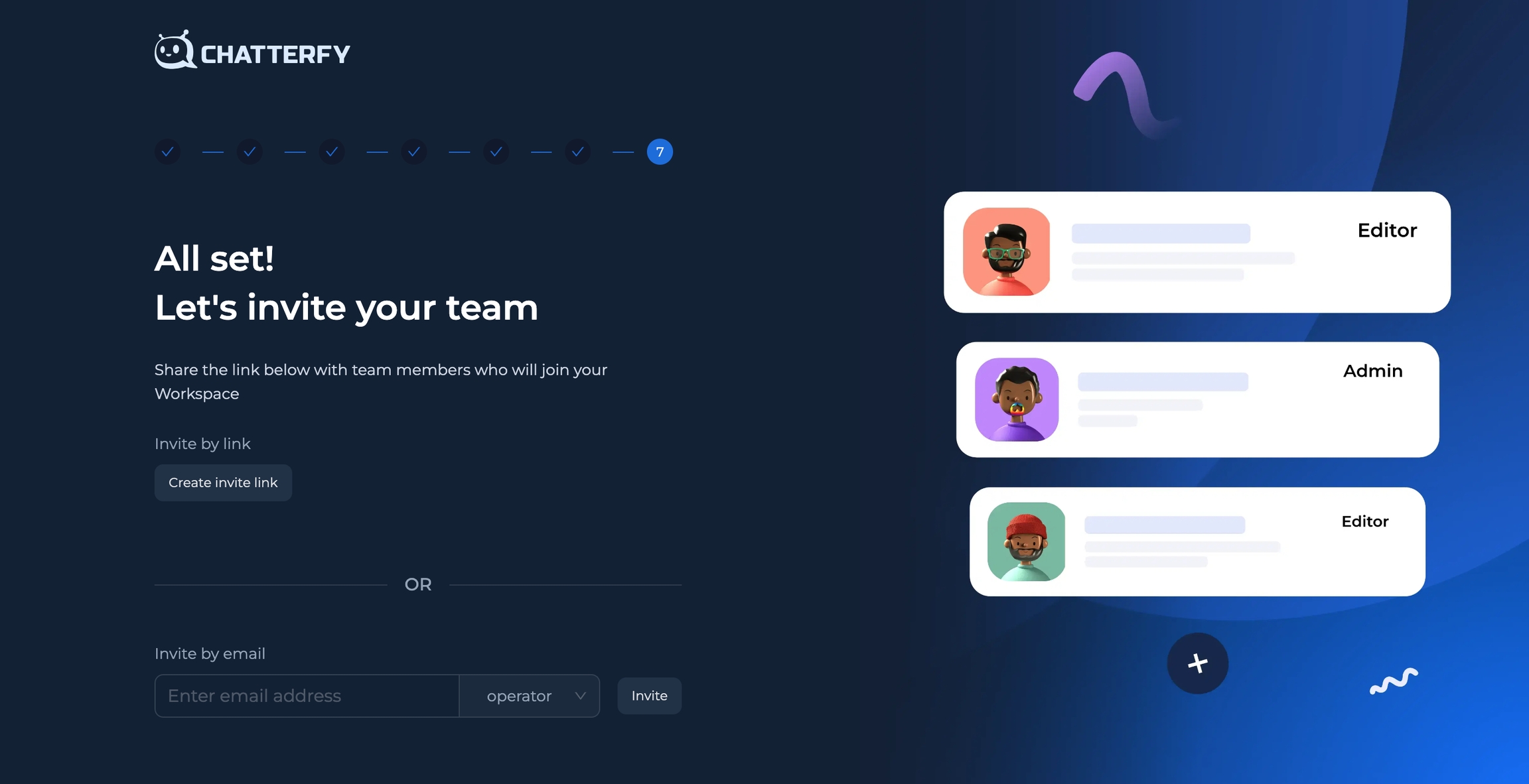 Если вам нужно пригласить коллег в вашу существующую компанию или присоединиться к ней, читайте раздел Приглашение сотрудника Создайте аккаунт за пару простых шагов и начинайте использовать Chatterfy уже сегодня: