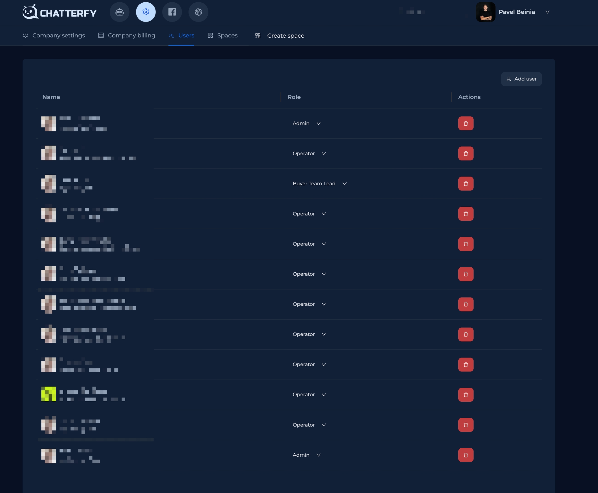 Стало: добавление пользователя в компанию и распределение прав доступа между спейсами из участников компании.