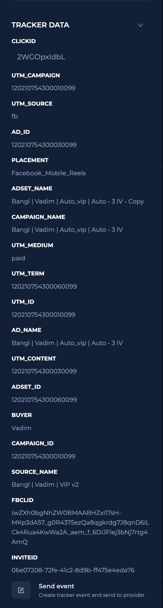 С функцией Tracker data прямо в меню чата с клиентом вы сможете просматривать всю информацию по настроенной кампании и отделу баинга.