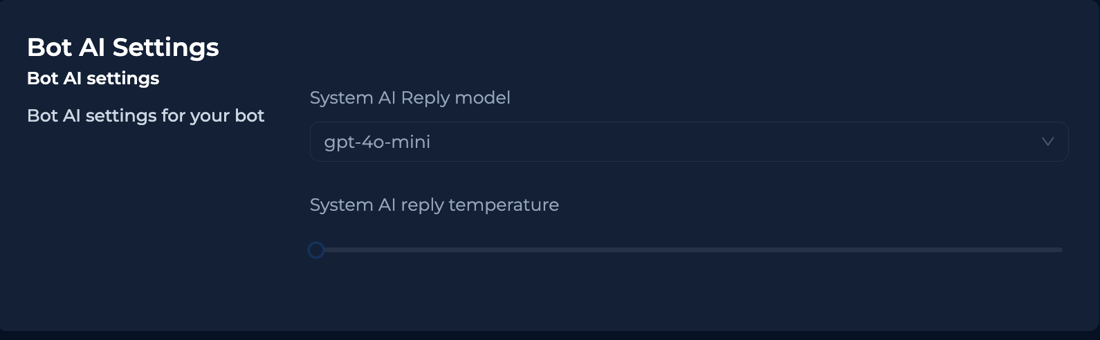 Внутри Global Bot Settings вы можете выбирать креативность ответа ИИ, а также модель обработки ИИ.
