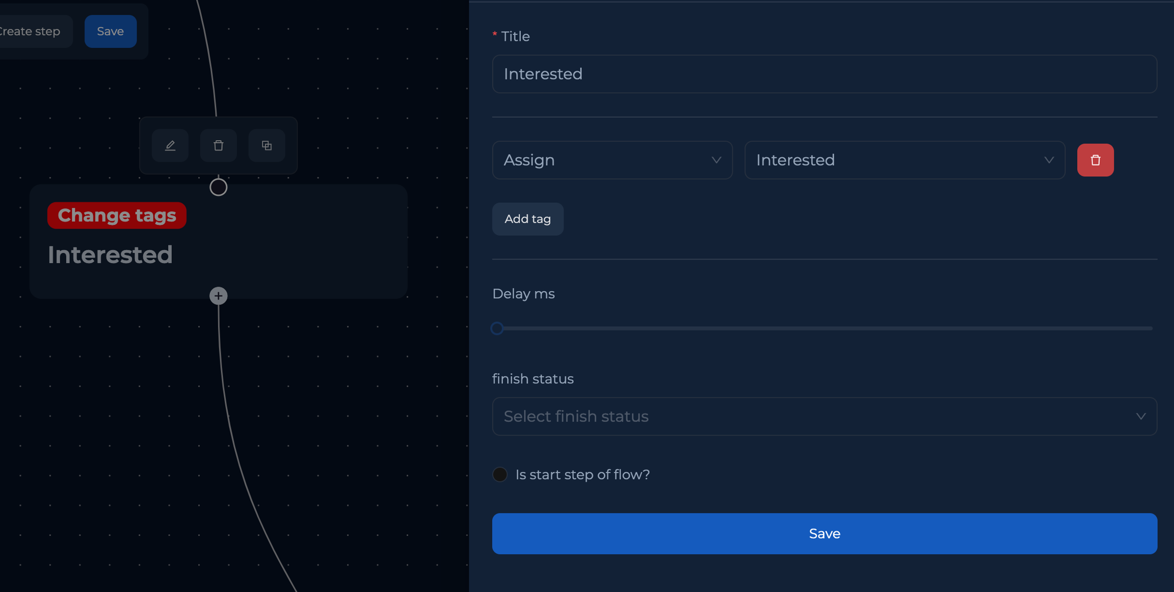 После этого создаем Change tags степ и указываем какие теги необходимо присвоить или удалить.