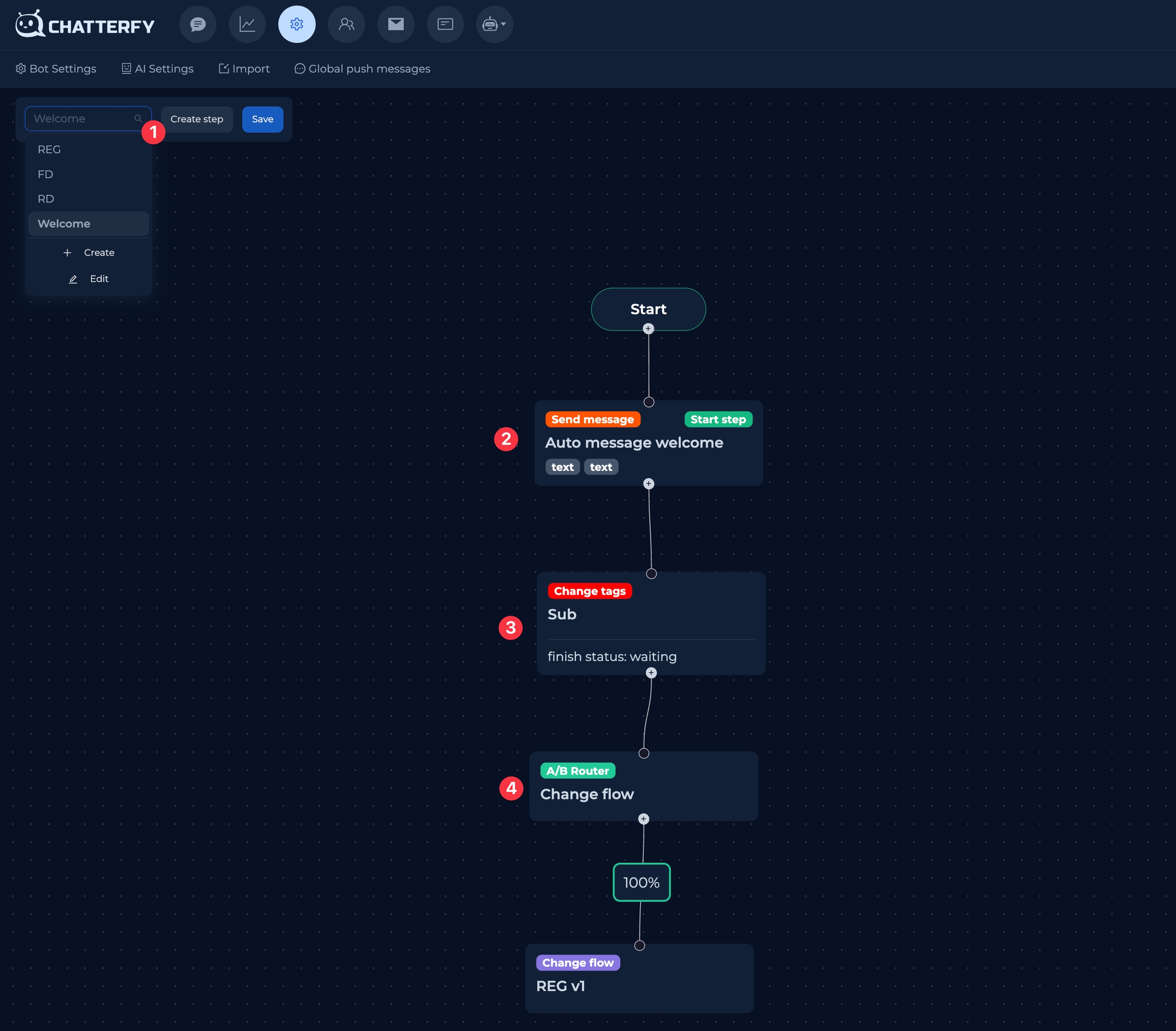 Также вы можете выбрать Start Flow и Start Step для вашего DM bot (не обязательно)