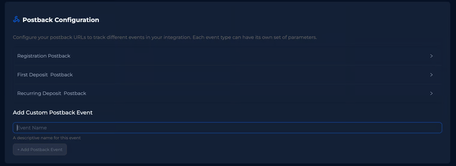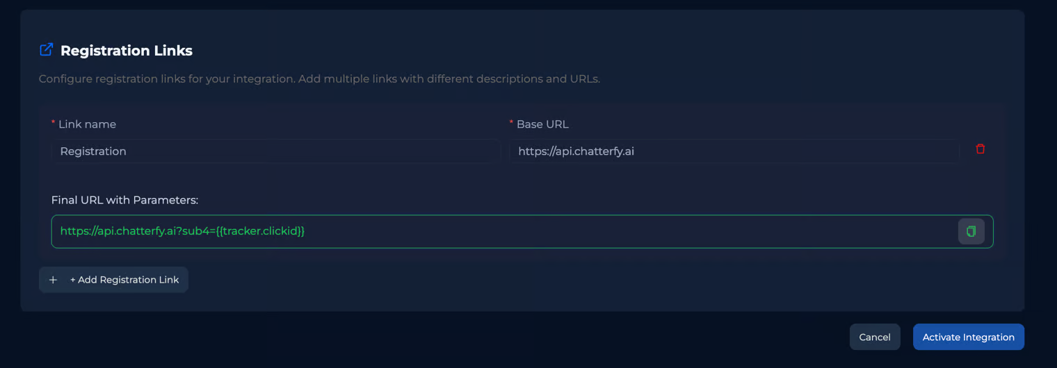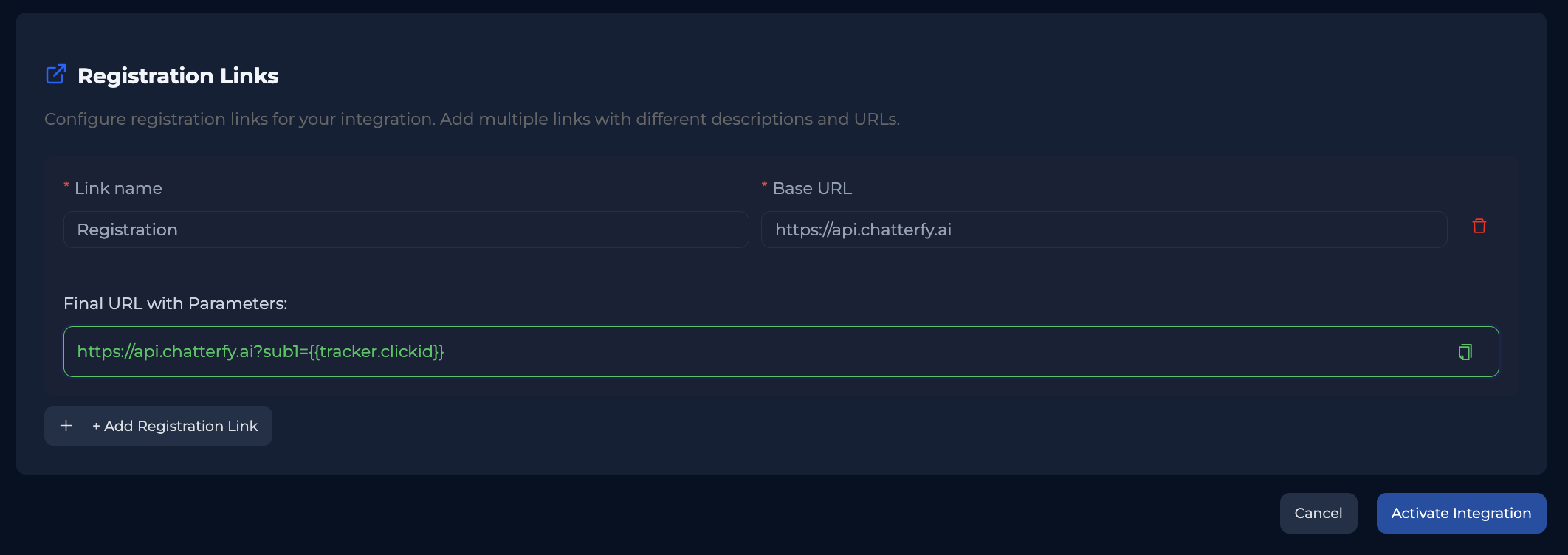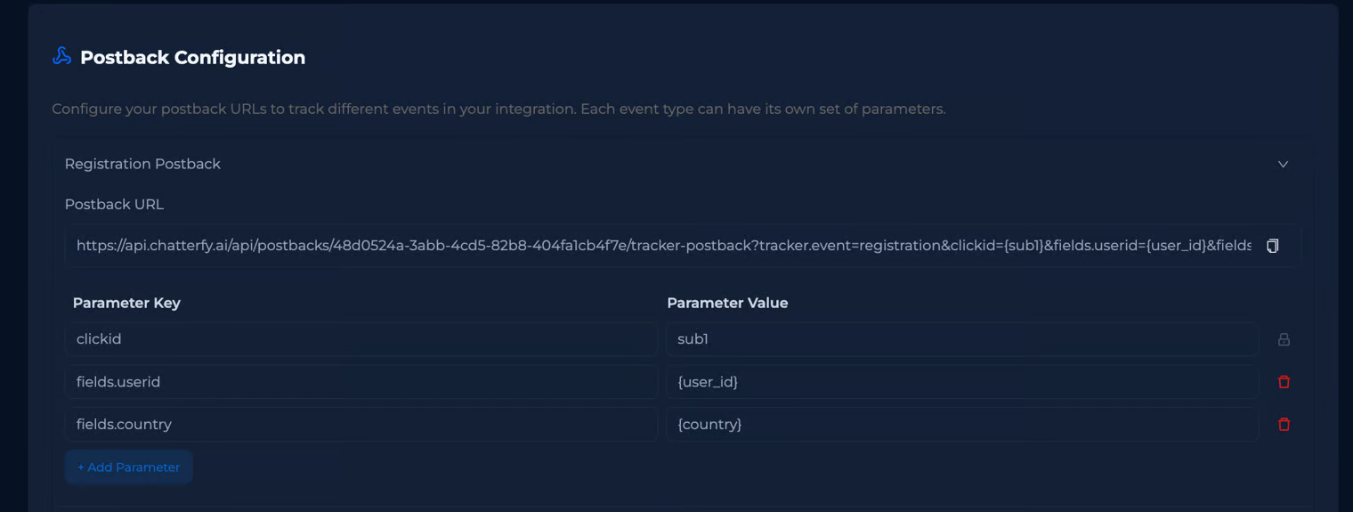 Например, <https://api.chatterfy.ai/api/postbacks/5540a501-882f-4a94-8b5d-a2b888a9fd0f/tracker-postback?clickid={clickid}&tracker.event=registration>\