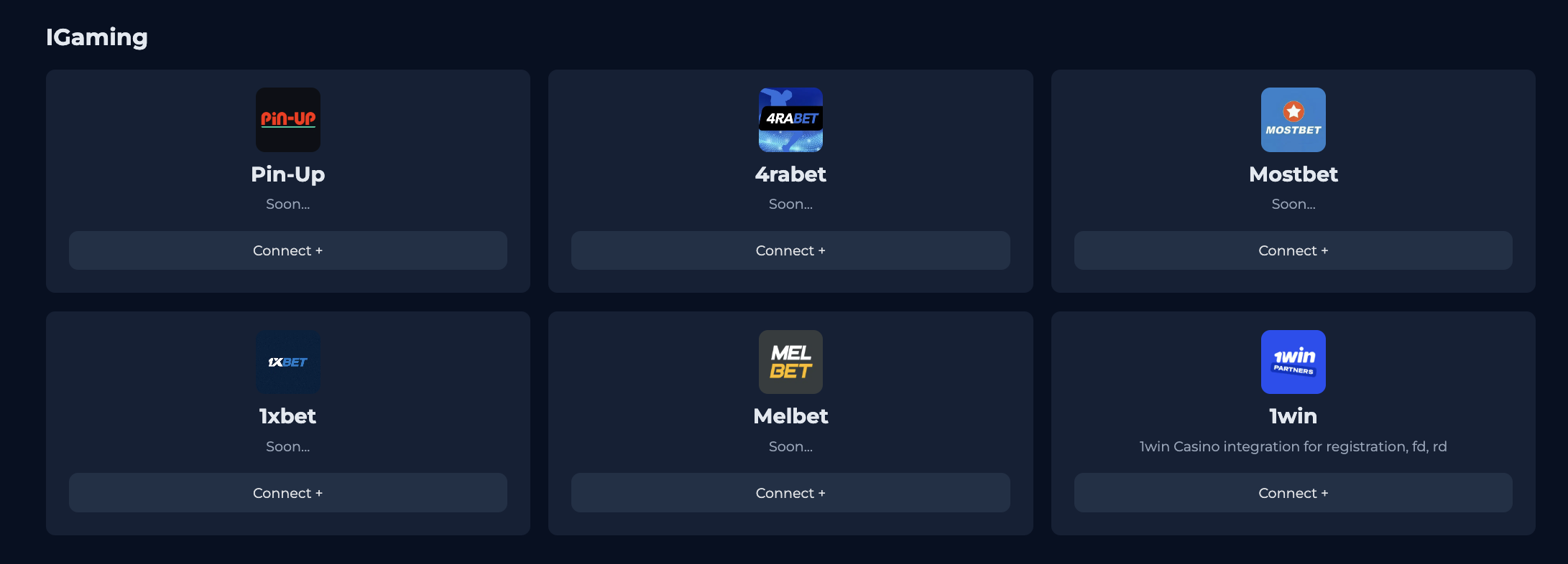 Разберем на примере IGaming, везде где написано soon - значит, что интеграция еще в разработке