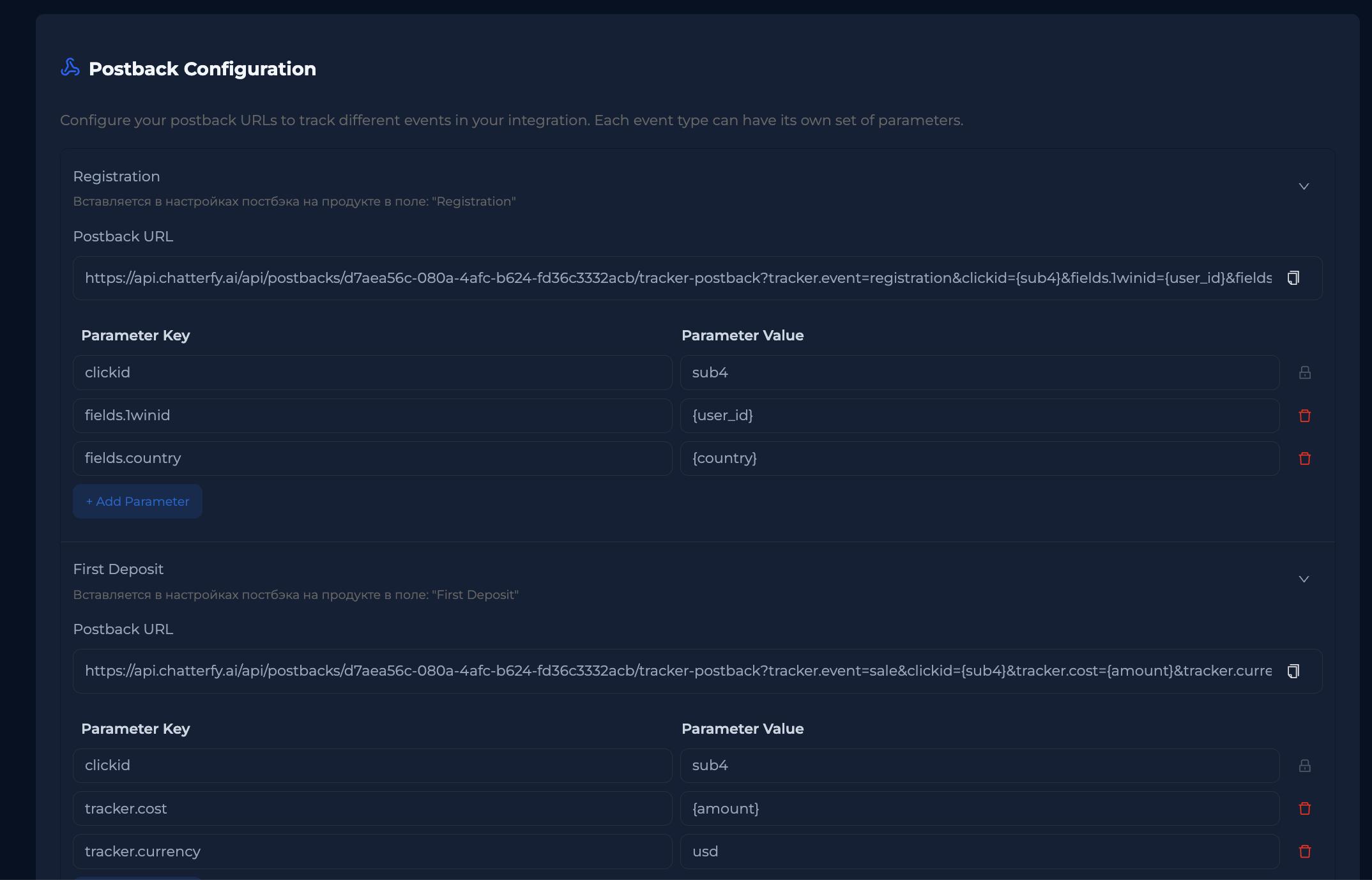 [https://api.chatterfy.ai/api/postbacks/48d0524a-3abb-4cd5-82b8-404fa1cb4f7e/tracker-postback?](https://api.chatterfy.ai/api/postbacks/48d0524a-3abb-4cd5-82b8-404fa1cb4f7e/tracker-postback?tracker.event=first_deposit_\&clickid={sub1})[tracker.event=sale\&clickid={sub1}\&tracker.cost={amount}\&tracker.currency=usd](https://api.chatterfy.ai/api/postbacks/6d1f4e36-b910-4fa1-98f0-11a2df93f054/tracker-postback?tracker.event=sale\&clickid={sub1}\&tracker.cost={amount}\&tracker.currency=usd)