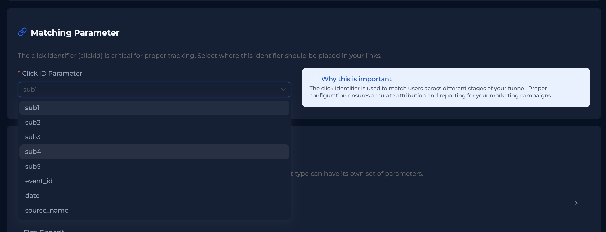 &#x20;<https://api.chatterfy.ai/api/postbacks/48d0524a-3abb-4cd5-82b8-404fa1cb4f7e/tracker-postback?tracker.event=first_deposit_&clickid={sub1}>
