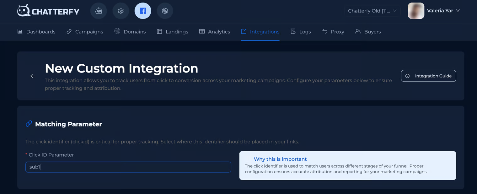 <https://api.chatterfy.ai?sub4=\\{{tracker.clickid\\}}\\&fields.userid={user\\_id}> - в данном случае мы из партнерки может автоматически забрать ID клиента и записать его в кастомное поле внутри СРМ&#x20;